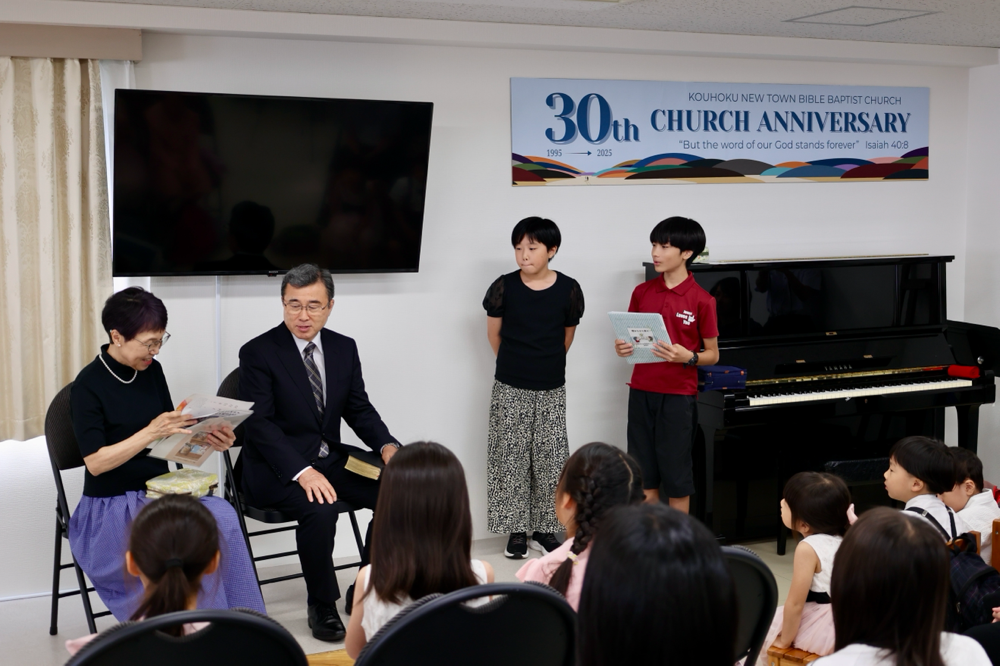 朝のキッズチャーチでは聖書のお話しが終わった後、インタビュー形式で鹿毛先生ご夫妻にお話しを聞きました。 今までのキッズチャーチの歩みや、開拓伝道をする上での困難や喜びなどをお伺いし、 喜びの時も涙の時もいつもみことばに励まされての歩みであった事をみんなで覚えるときでした。
